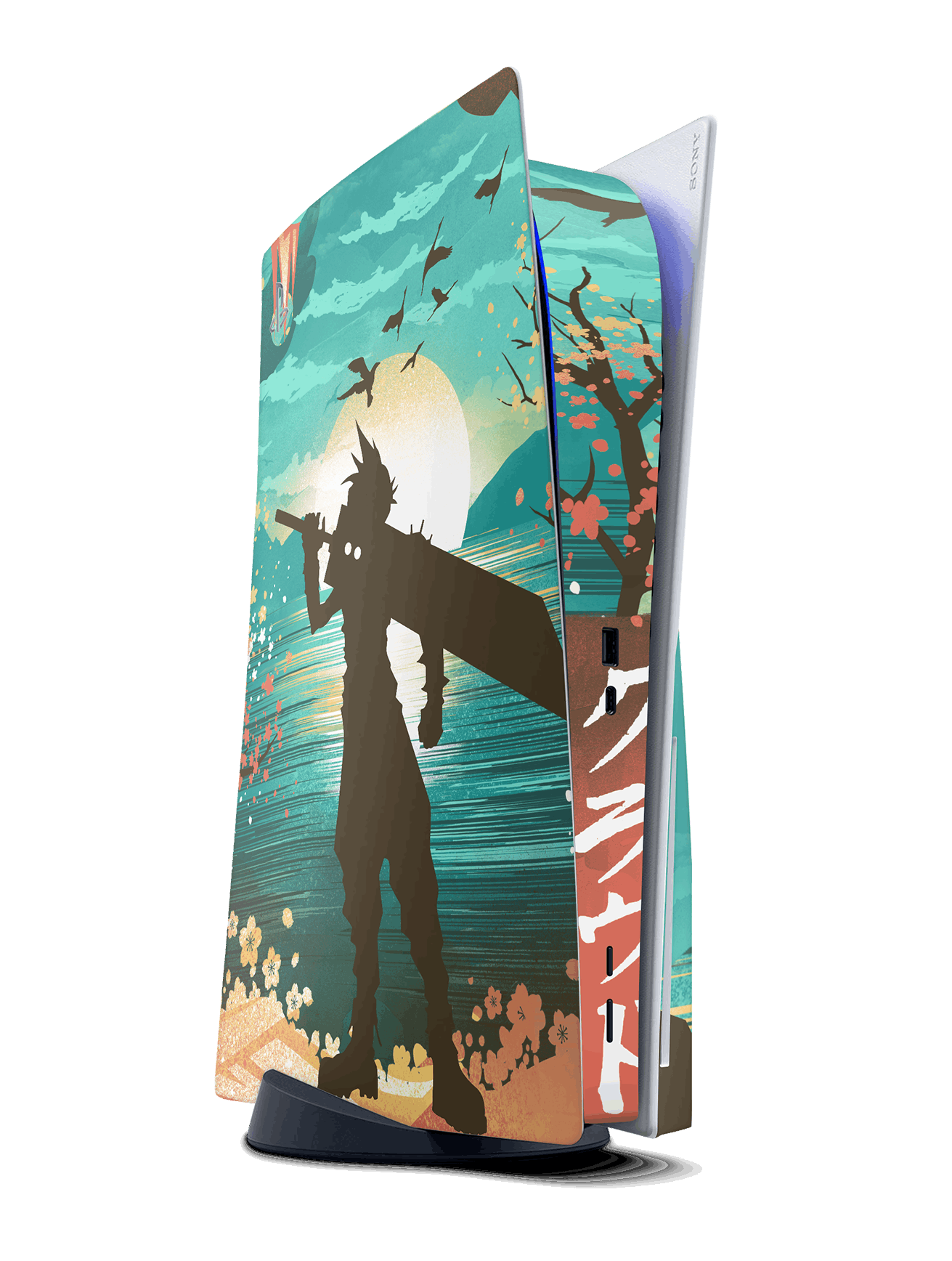 Proudly in collaboration with artist Dandingeroz, Cloud Ukiyo is the perfect PS5 Pro, PS5 Slim Disc, PS5 Slim Digital, PS5 Disc or PS5 Digital vinyl console cover for any Final Fantasy 7 fan! This original work of art is inspired by FF7, but with an Ukiyo twist. Ukiyo is a Japanese art style that dates back to the 17th century. GameVinyl console skins for Sony PlayStation 5 are made in the USA and protect your console from scratches, dust and stains while making it look absolutely awesome.