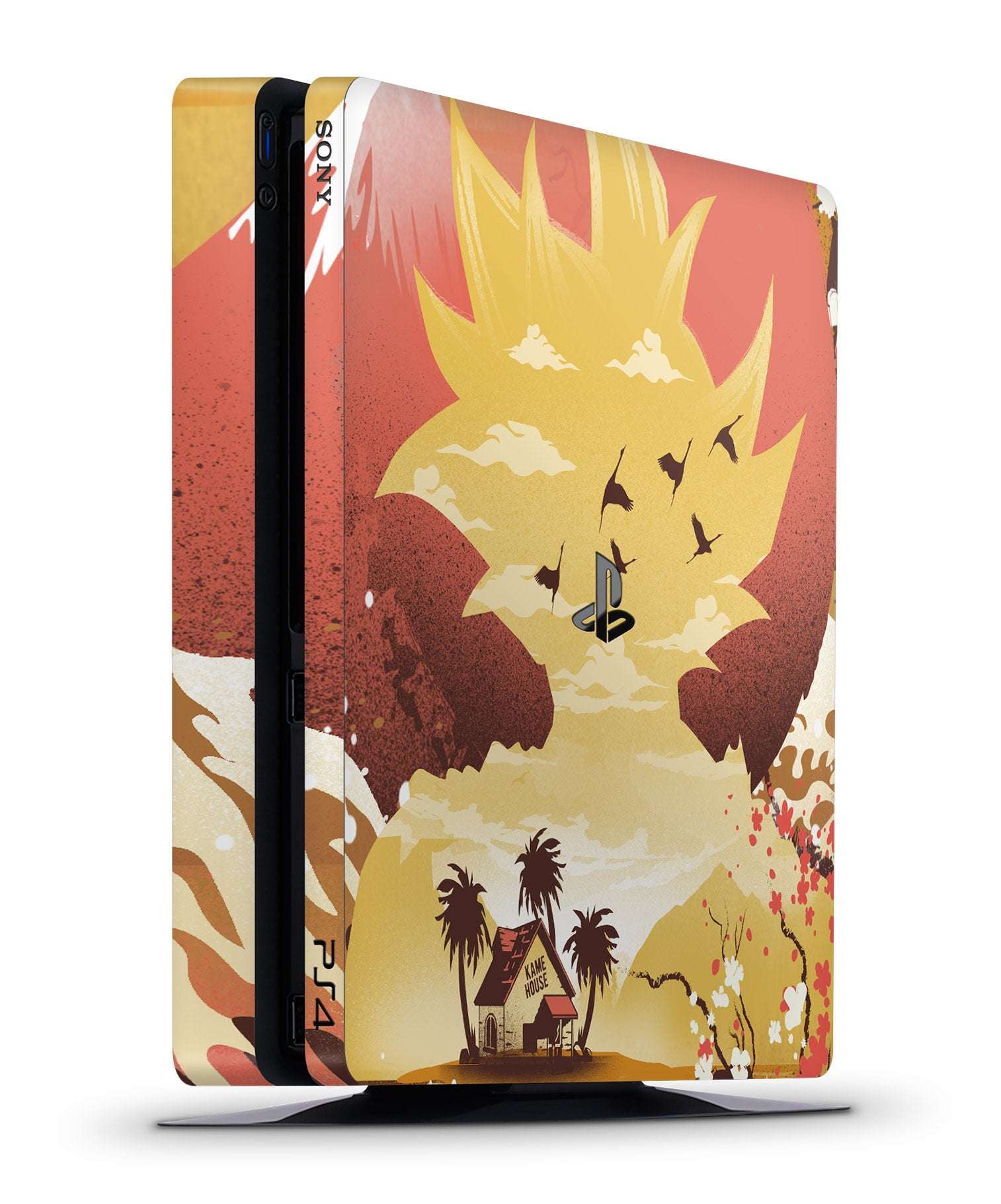 Transform your PS4 Slim in minutes with this full-coverage (including the bottom), originally designed console cover featuring original art by Dandingeroz inspired by DBZ. Our GameVinyl console wraps for Sony PlayStation 4 Slim are made in the USA and protect your console from scratches, dust and stains while making it look absolutely awesome.