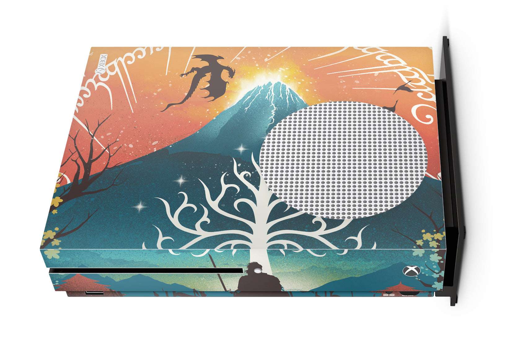 Proudly in collaboration with renowned artist Dandingeroz, The One Ring is the perfect Xbox One S vinyl console skin for any Lord of the Rings fan! This original work of art is inspired by LOTR, but with an Ukiyo twist. Ukiyo is a Japanese art style that dates back to the 17th century. GameVinyl console covers for Xbox One S are made in the USA and protect your console from scratches, dust and stains while making it look absolutely awesome.